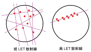 このことは、「低LET放射線」であるX線・ガンマ線が、細胞にほぼ均一に傷害を作るのに対して、中性子線やアルファ線のような「高LET放射線」の場合には、同じ線量(すなわち同じ量のラジカル生成)でも細胞の局所に傷害がかたよって生じることを意味している。つまり「高LET放射線」によって細胞の一部に集中して生じた傷は、「低LET放射線」によって細胞にまんべんなく生じた傷よりも修復が難しい、すなわち細胞に与える影響が大きい、ということなのである。